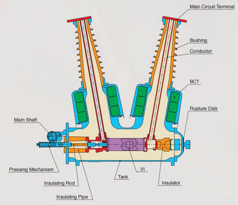 For each phase, a current breaking vacuum interrupter is accommodated in the grounded tank. The operation system is such that closing and tripping are effected by spring force.The operating mechanism and 3-phase interlinkage are assembled on a common base, which is installed on the frame legs.