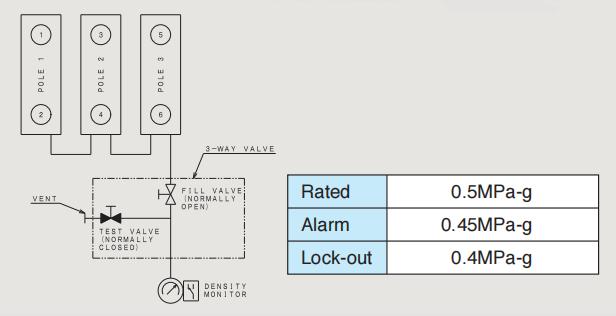 Withstand voltage characteristics :Performance of withstand voltage is assured at the specified dry air pressure. Even though the dry air pressure has been lowered to the alarming level, the required insulation level can be assured.In addition, even though this pressure lowers to the atmosphericpressure, the circuit breaker withstands the rated voltage.