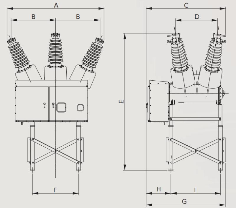 The overall structure is composed mainly of grounded tank, vacuum interrupters (VI), insulating rods, bushings and main circuit terminals. Each grounded tank is filled with dry air maintained at a rated pressure of 0.5MPa-g (20℃).